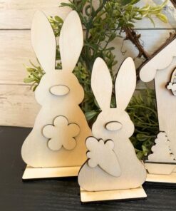The large bunny is 6.75″ tall by 3.5″ at the widest and 1/8″ thick. The base is 1/8″ thick.